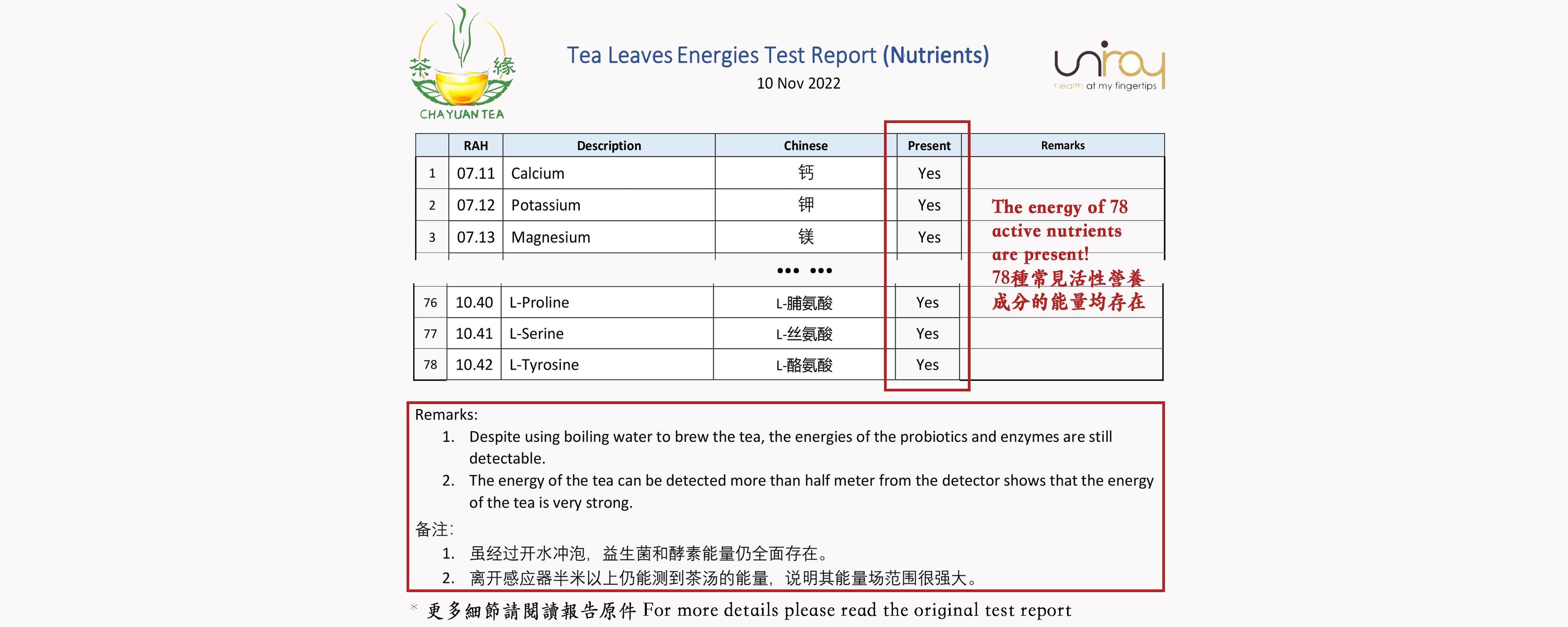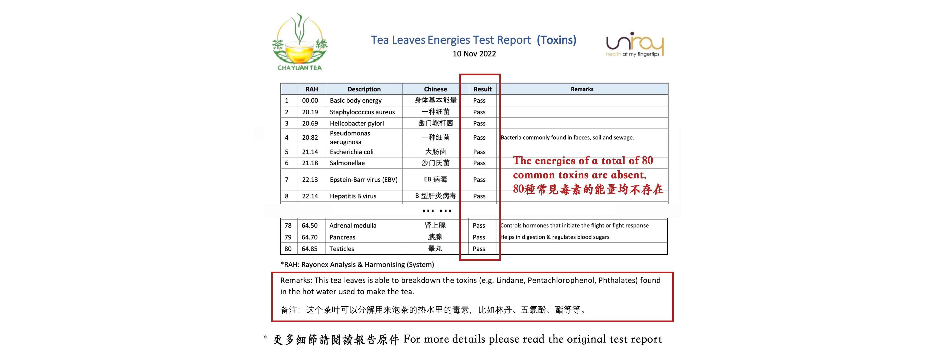 When we use quantum instruments to detect it, we find that there are many harmful energy frequencies such as chlorine, fungicides, and pesticides in tap water. After adding a little Cha Yuan Tea, these harmful frequencies are no longer detectable, which means Cha Yuan Tea has eliminated the energy of all these contemporary chemical toxins. Therefore, we recommend that you drink as much Cha Yuan tea as possible. The tea itself has no toxicity, can detoxify, and its taste is better than water.